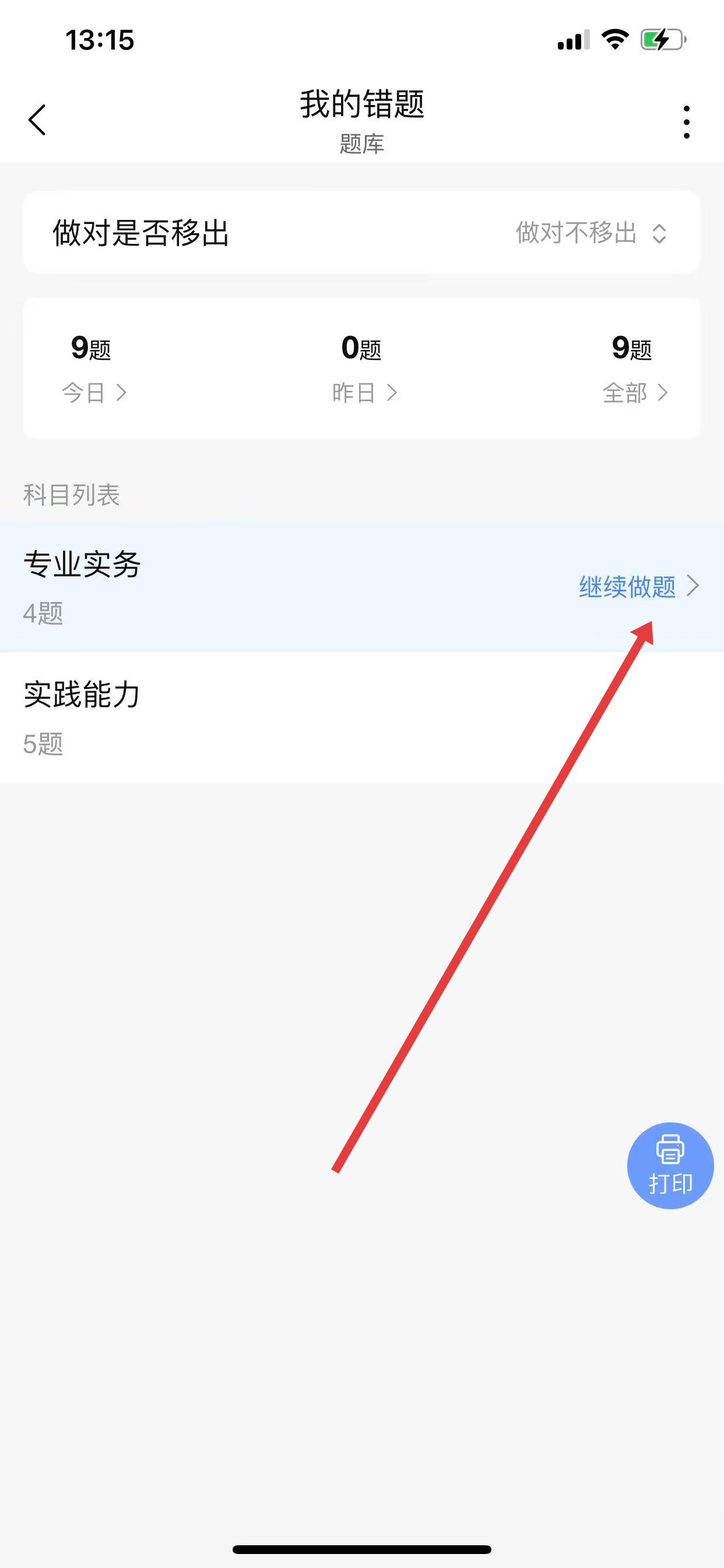2、在我的錯(cuò)題頁(yè)面,可以查看今日和昨日的題目數(shù)量,點(diǎn)擊繼續(xù)做題可再做一次。