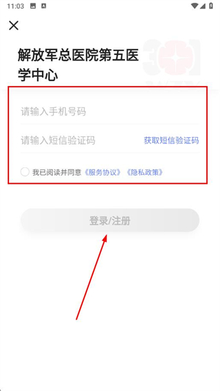 2、輸入手機(jī)號碼,填入驗(yàn)證碼,勾選服務(wù)協(xié)議和隱私政策,點(diǎn)擊登錄/注冊按鈕。