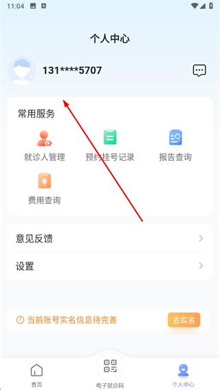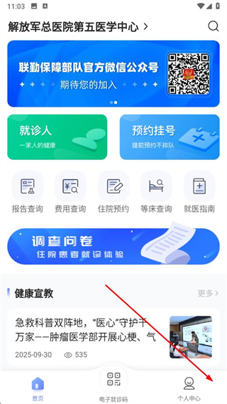 1、打開中國人民解放軍總醫(yī)院相關(guān)app,點(diǎn)擊底部導(dǎo)航欄中的個人中心選項(xiàng)。