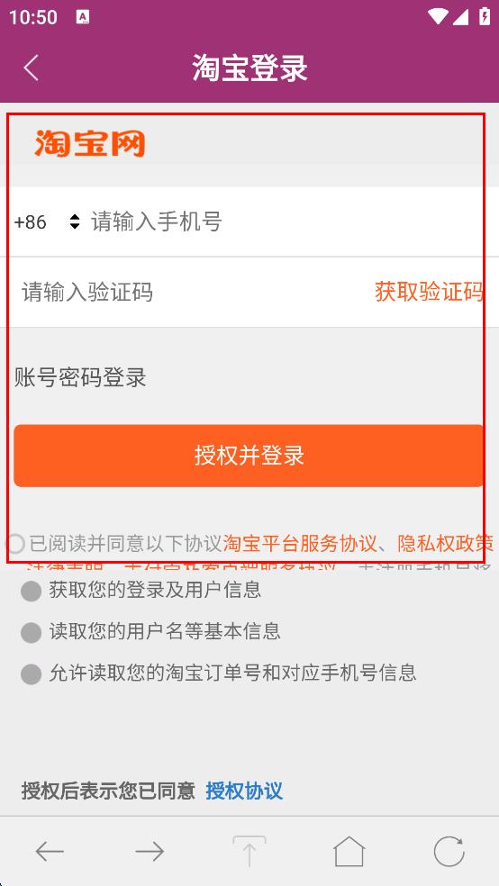 3、進(jìn)入淘寶登錄頁(yè)面,輸入手機(jī)號(hào)和驗(yàn)證碼,勾選協(xié)議后點(diǎn)擊授權(quán)并登錄。