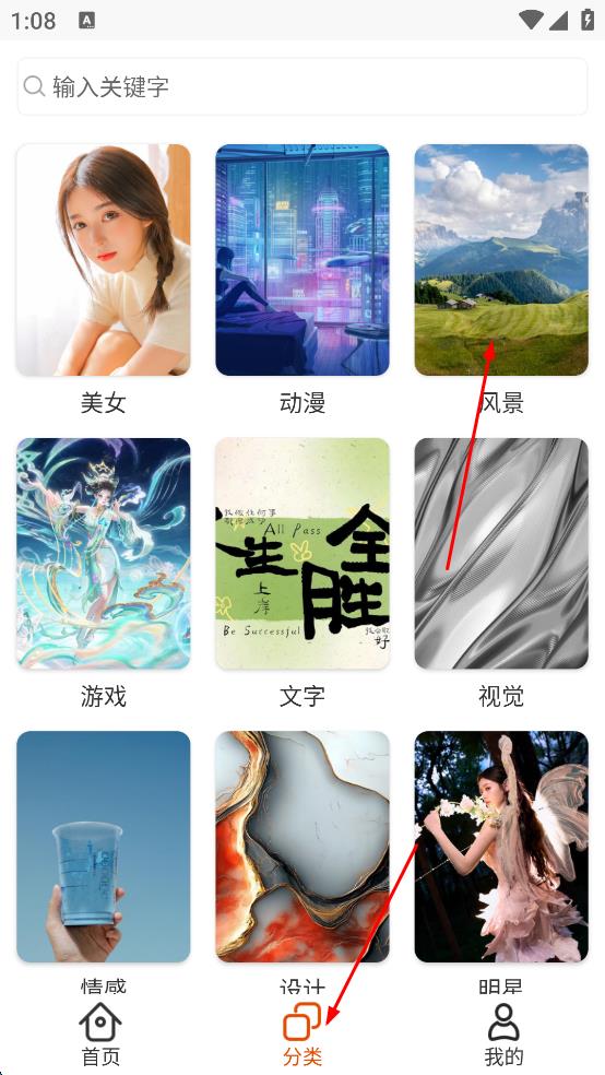 1、打開壁紙應(yīng)用,點(diǎn)擊底部“分類”標(biāo)簽,在分類頁(yè)面找到“風(fēng)景”類別,點(diǎn)擊進(jìn)入風(fēng)景壁紙列表。