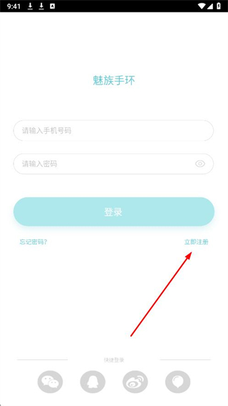 1、打開(kāi)魅族手環(huán)APP,在登錄頁(yè)面點(diǎn)擊立即注冊(cè)。
