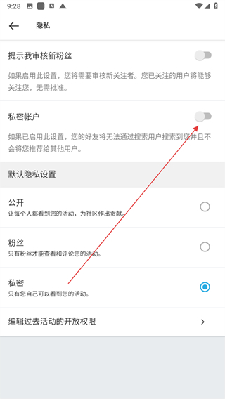 4、在隱私設(shè)置頁(yè)面找到私密賬戶功能開(kāi)關(guān),將其開(kāi)啟。