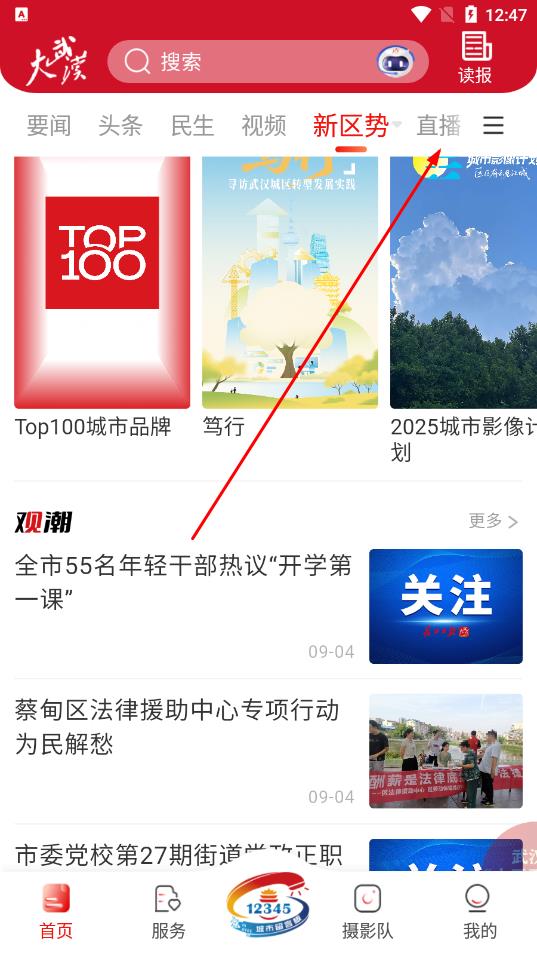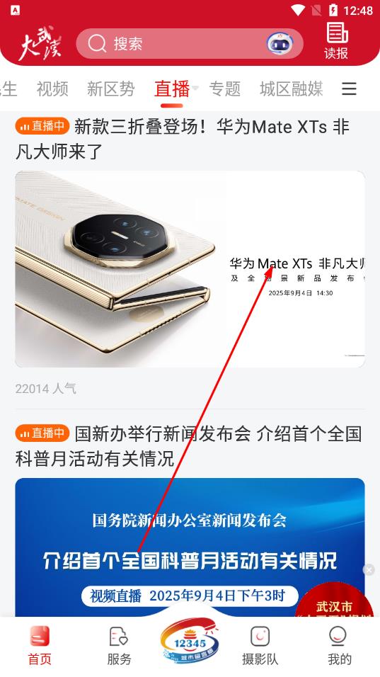 1、打開(kāi)大武漢App,進(jìn)入首頁(yè),點(diǎn)擊上方導(dǎo)航欄中的直播選項(xiàng)。