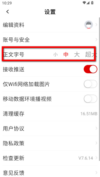 3、在設(shè)置頁(yè)面,找到正文字號(hào)選項(xiàng),選擇小、中、大或超大字號(hào)即可。