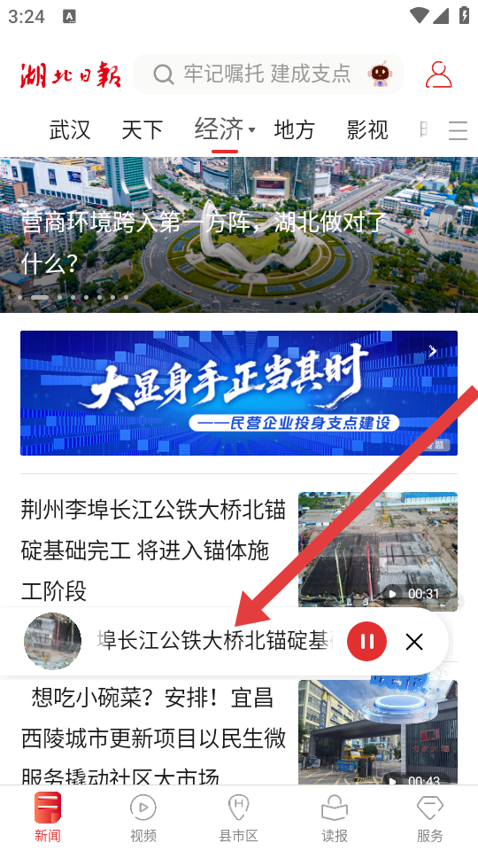2、點(diǎn)擊后會彈出音頻播放條,需要點(diǎn)擊播放條進(jìn)入新聞音頻播放界面。