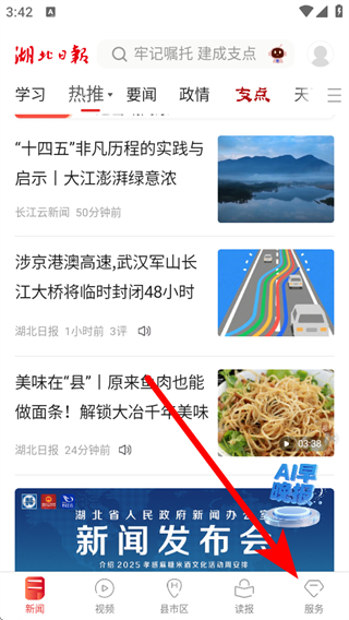 1、打開湖北日報(bào)app,需要點(diǎn)擊底部服務(wù),進(jìn)入服務(wù)的頁面。