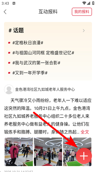 3、在互動報(bào)料頁面點(diǎn)擊右下角+號,進(jìn)入報(bào)料編輯的頁面。