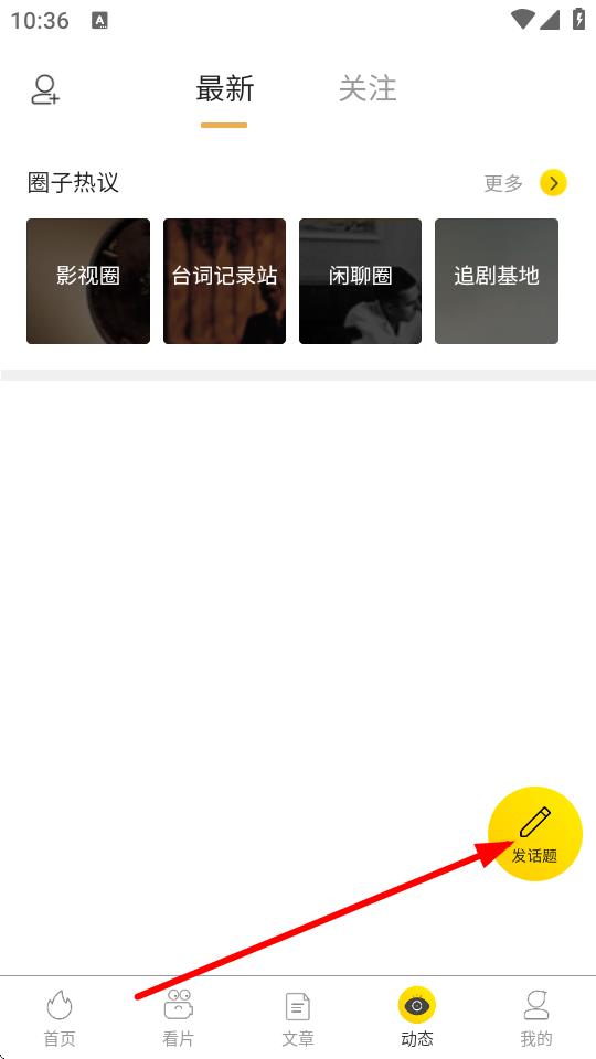 2、在動態(tài)頁面,點(diǎn)擊右下角黃色發(fā)話題按鈕,進(jìn)入發(fā)布話題界面。