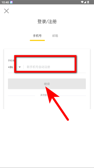 3、在登錄注冊界面,輸入手機(jī)號后點(diǎn)擊繼續(xù),進(jìn)入注冊信息填寫頁面。