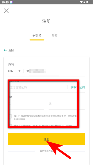 4、在注冊信息填寫頁面,完善驗(yàn)證碼、姓名等信息并勾選協(xié)議后,點(diǎn)擊注冊按鈕,即可完成注冊操作。