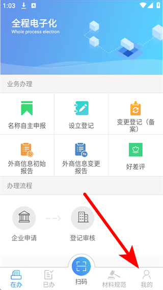 2.點擊我的,進入主頁,點擊名稱預(yù)約審核,點擊右上角如圖,進入到企業(yè)名稱審核。