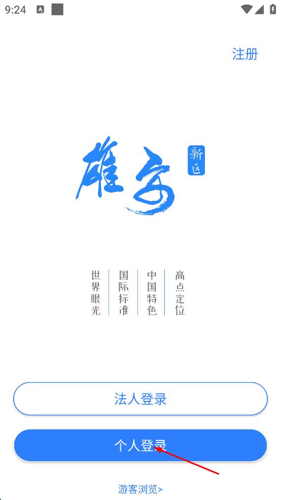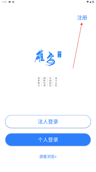 1、打開政通雄安的軟件,在首頁(yè)上方點(diǎn)擊注冊(cè)的按鈕。