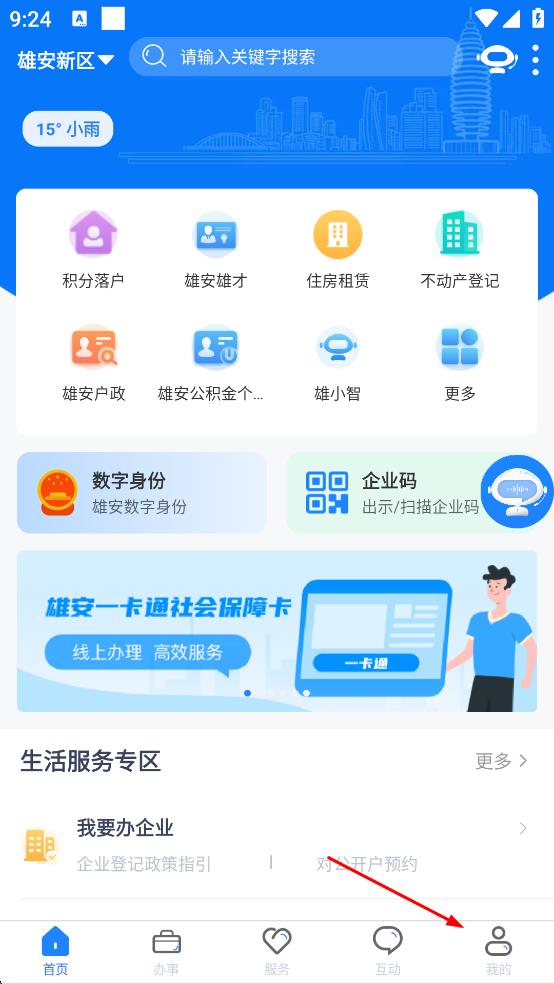 1、打開雄安相關(guān)軟件,進(jìn)入首頁(yè)后,點(diǎn)擊右下角我的,進(jìn)入個(gè)人頁(yè)面。