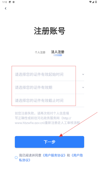 3、在該頁(yè)面內(nèi),輸入相關(guān)信息后點(diǎn)擊下一步的按鈕即可。