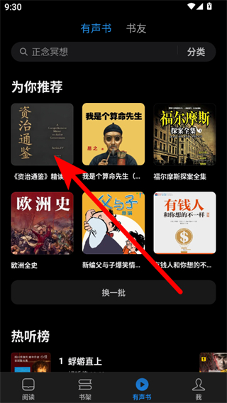 2、在有聲書頁面,點(diǎn)擊要聽的有聲書,進(jìn)入聽書界面。