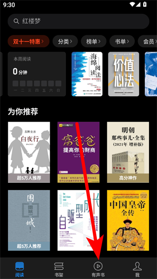 1、在微信讀書首頁,點(diǎn)擊下方有聲書選項(xiàng),進(jìn)入有聲書頁面。