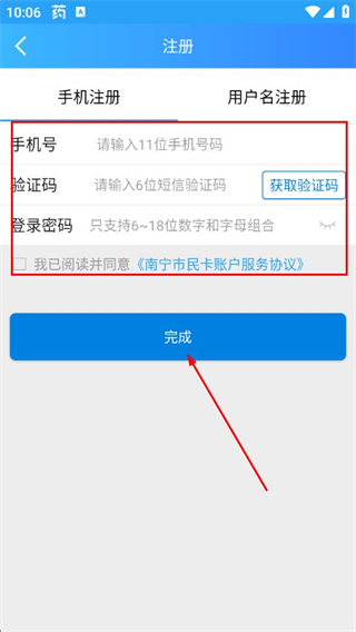 4、輸入手機號、驗證碼、登錄密碼,勾選后,點擊完成。