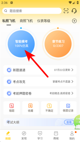 1、在刷題的頁(yè)面,點(diǎn)擊智能??嫉陌粹o,進(jìn)入智能模考的頁(yè)面。