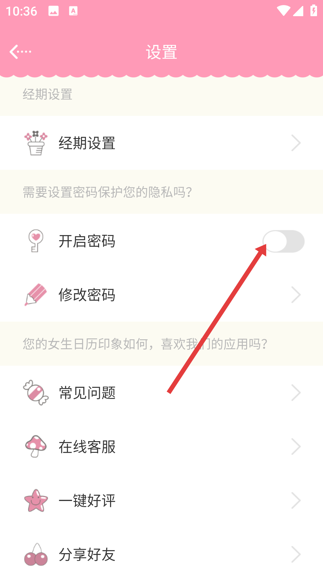 3、在設置界面中,找到開啟密碼選項,點擊其右側(cè)開關將其打開。