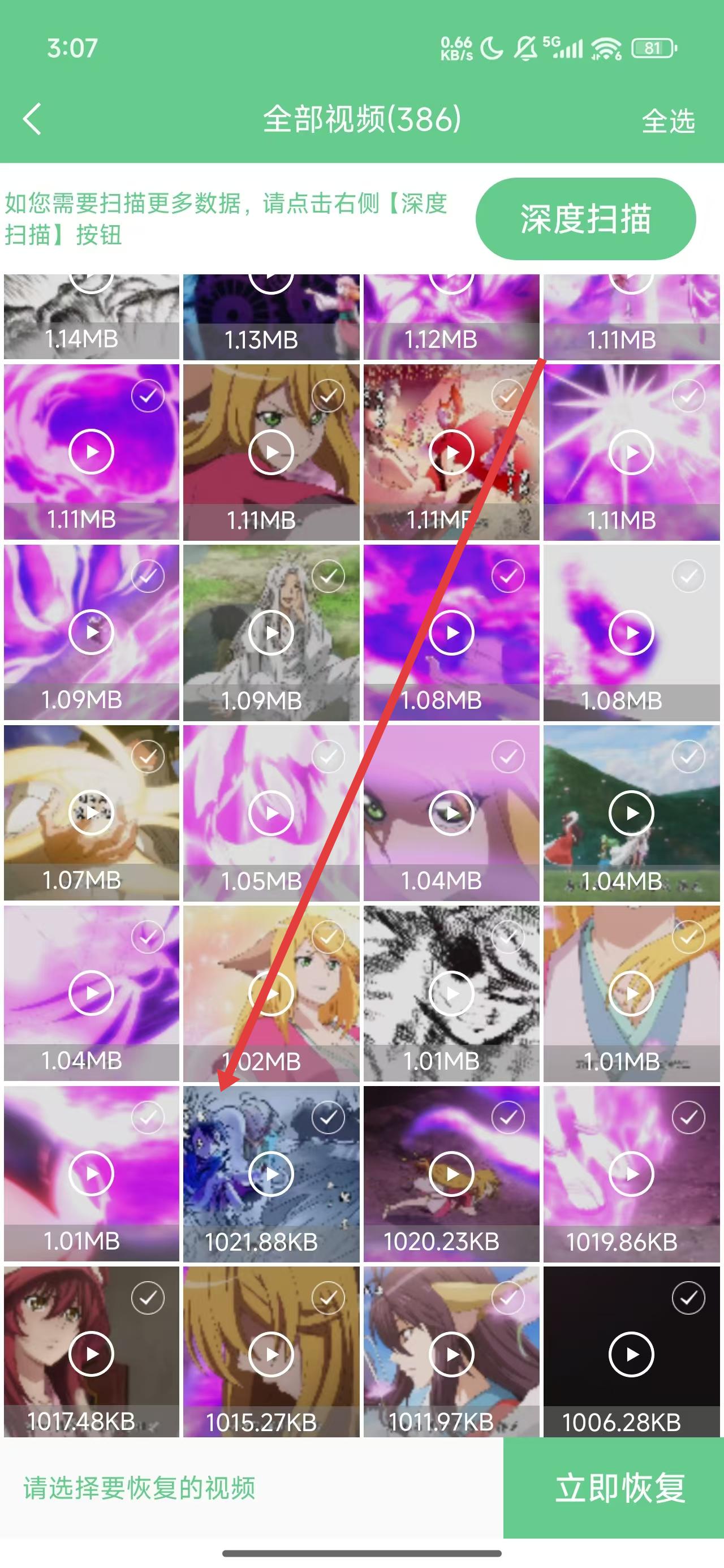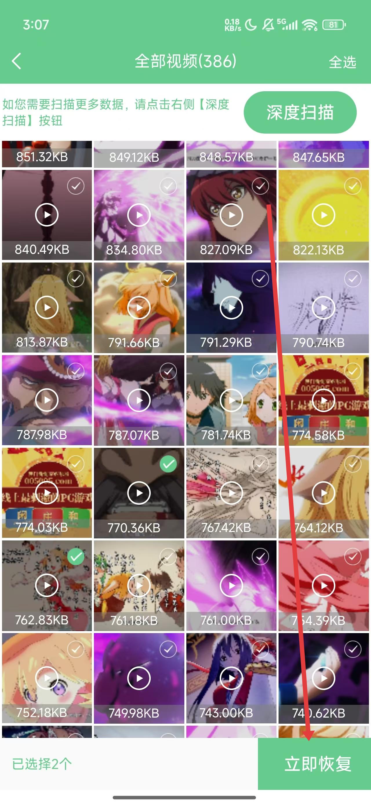 2、在進行掃描好視頻后,可以下拉勾選要恢復的視頻進行恢復。