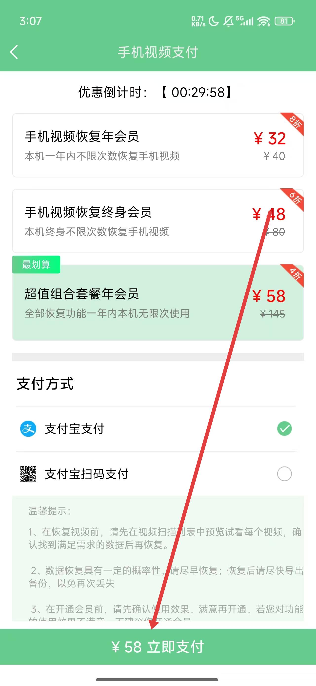 4、跳轉到支付頁面,點擊下方的立即支付按鈕,在支付后即可完成視頻的恢復操作。