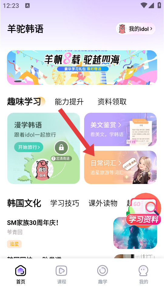 1、在首頁趣味學(xué)習(xí)板塊,點(diǎn)擊日常詞匯,進(jìn)入詞匯學(xué)習(xí)分類頁面。