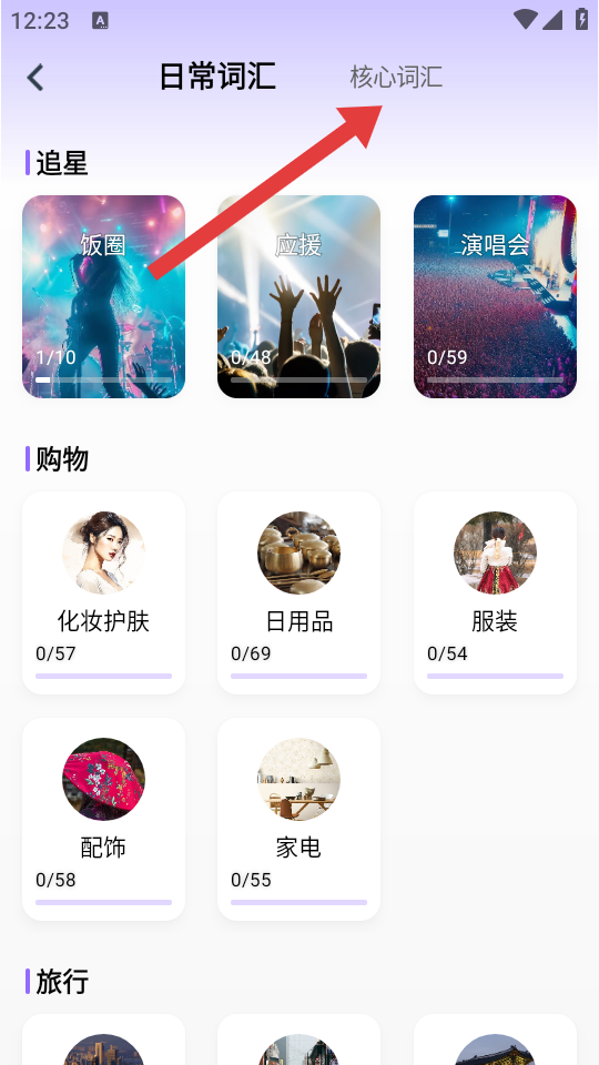2、在日常詞匯的頁面,點(diǎn)擊核心詞匯,切換至核心詞匯的板塊。