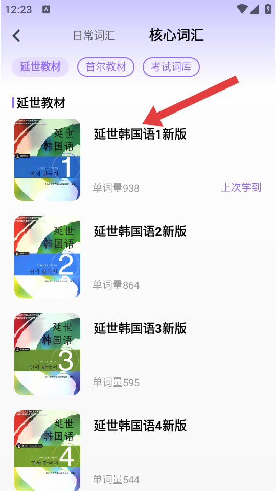 3、在教材分類中,選擇延世韓國語1新版,進(jìn)入對(duì)應(yīng)教材的詞匯列表頁面。