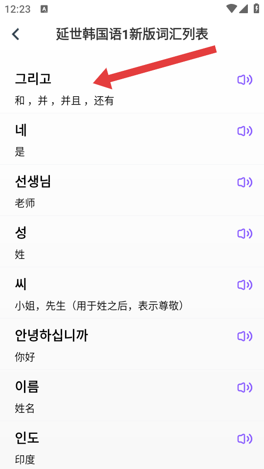 4、進(jìn)入延世韓國語1新版詞匯列表后,可學(xué)習(xí)具體單詞如???等。