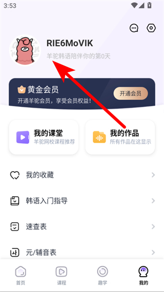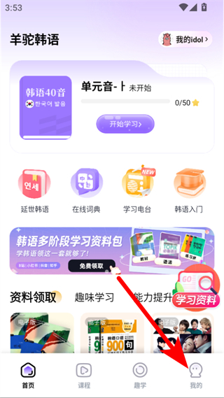 1、打開羊駝韓語APP,點(diǎn)擊底部導(dǎo)航欄的我的選項(xiàng),進(jìn)入個(gè)人頁面。