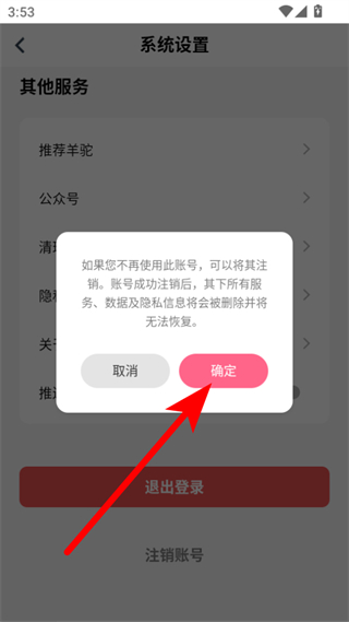 3、在系統(tǒng)設(shè)置頁面,點(diǎn)擊注銷賬號(hào)選項(xiàng),彈出賬號(hào)注銷提示框。