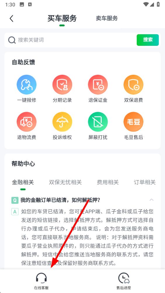 3、在頁面底部找到在線客服選項并點擊,進入在線客服對話窗口,在窗口內輸入想要咨詢的問題,即可與瓜子二手車客服取得聯(lián)系。