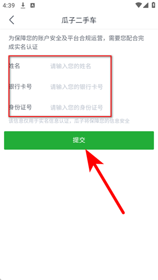4、在實名認證頁面,依次輸入姓名、銀行卡號、身份證號,輸入完成后點擊提交按鈕,即可完成實名認證。