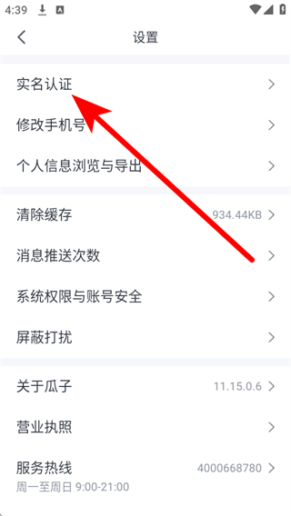 3、在設置界面里,點擊實名認證選項,進入實名認證頁面。