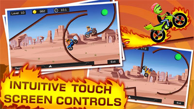 這是一個(gè)摩托特技競(jìng)速游戲,操作簡(jiǎn)單,但是要得到高分需要技巧??刂颇ν熊嚤M快的通過精心設(shè)計(jì)的道路到達(dá)終點(diǎn)。得分越高,得到的金幣就越多。在空中旋轉(zhuǎn)360度可以獲得額外的獎(jiǎng)勵(lì)。