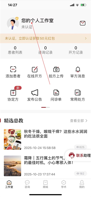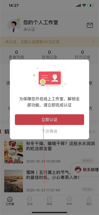 1、打開藥匣子APP,進入您的個人工作室頁面,點擊立即認(rèn)證。