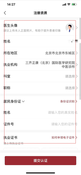 3、上傳頭像,填寫姓名、所在地區(qū)、執(zhí)業(yè)機構(gòu)、科室、職稱等信息。填寫居民身份證信息,包括真實姓名和證件號。