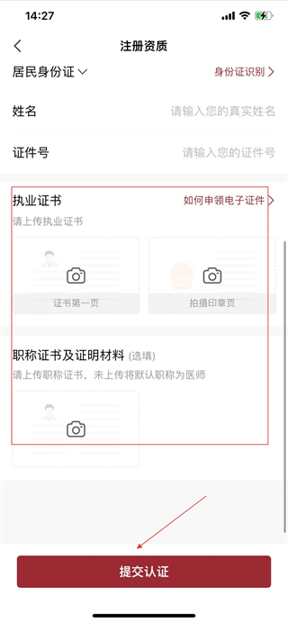 4、上傳執(zhí)業(yè)證書和職稱證書及證明材料,最后點擊提交認(rèn)證,完成實名認(rèn)證流程。