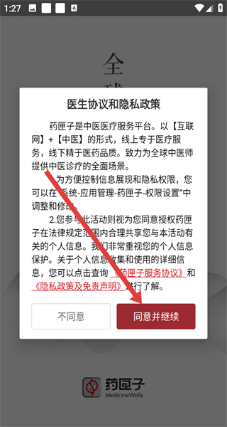 1、打開藥匣子APP,點擊同意并繼續(xù)按鈕,確認(rèn)醫(yī)生協(xié)議和隱私政策,進入APP主界面。