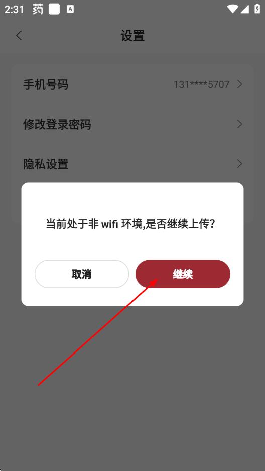 3、在設(shè)置頁面點擊上傳日志選項,彈出非wifi環(huán)境的確認(rèn)彈窗。