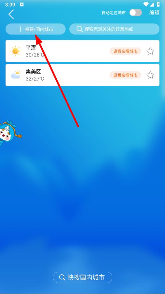 2、進入城市管理頁面,點擊添加福建國內(nèi)城市的按鈕。