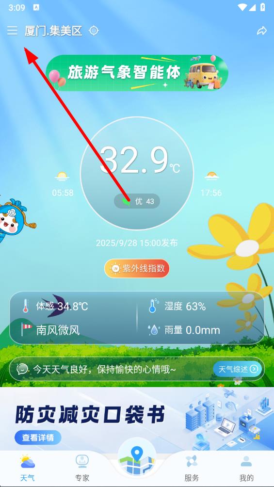 1、打開知天氣app,點擊左上角當(dāng)前定位城市名稱的位置。