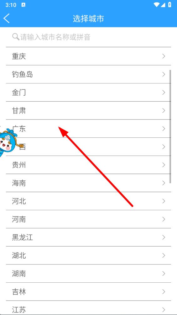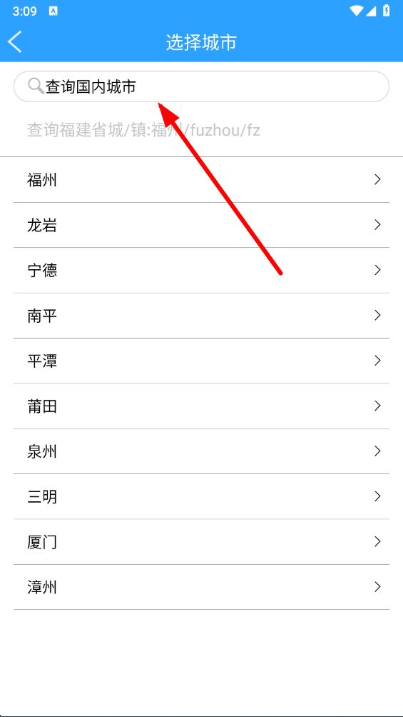 3、在選擇城市頁面,可以直接在下方列表中點擊想要添加的區(qū)域,若沒有,點擊搜索框。