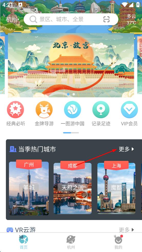 2、在軟件主界面,找到“當季熱門城市”板塊,點擊其旁的“更多”選項,進入城市選擇頁面。