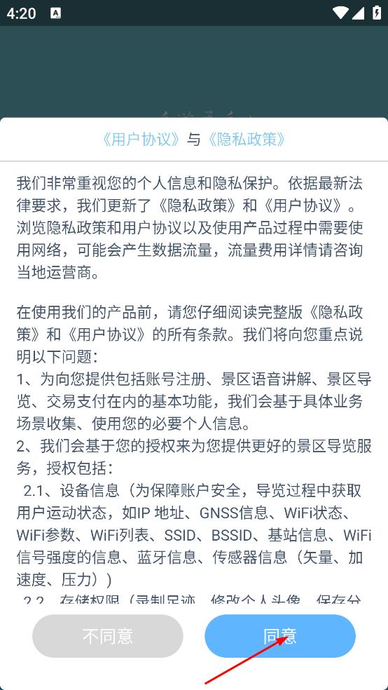 1、打開景區(qū)導覽軟件,彈出用戶協(xié)議與隱私政策提示頁面,仔細閱讀相關(guān)內(nèi)容后,點擊“同意”按鈕,進入軟件主界面。
