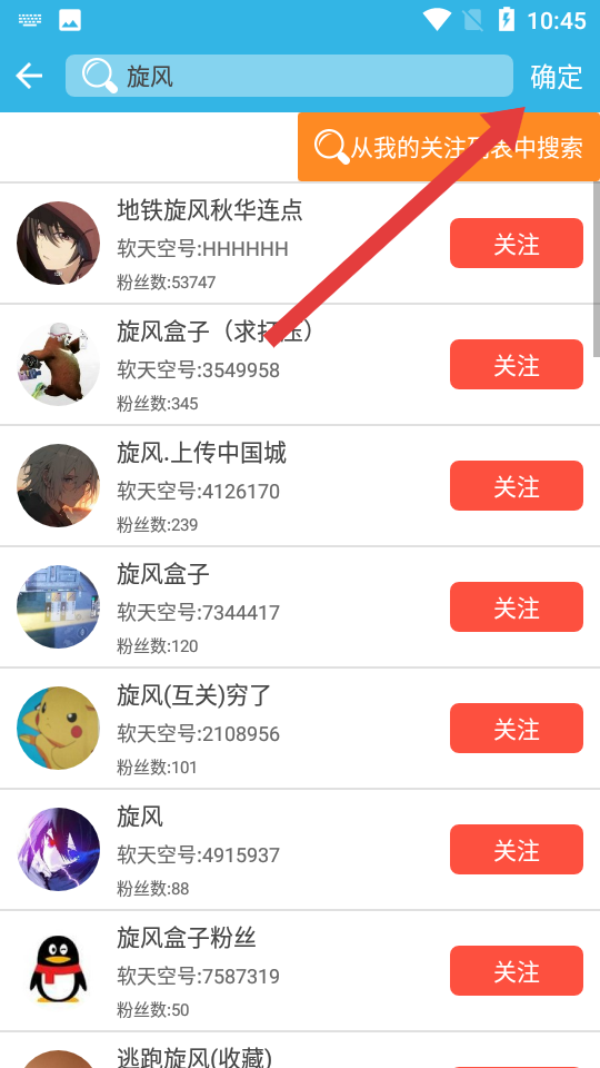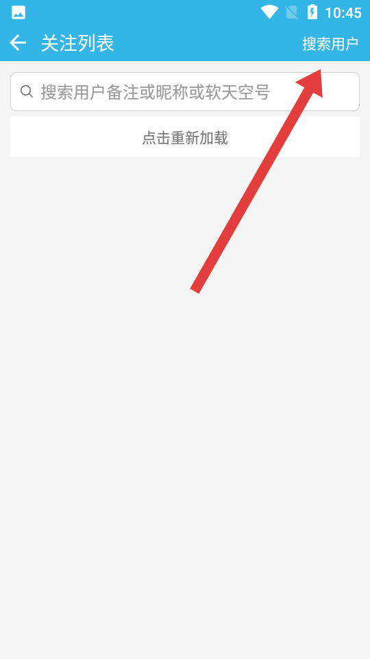 2、在關(guān)注列表頂部有個搜索框需要點擊它,輸入需要搜索的用戶名字昵稱、備注或軟天空號均可。