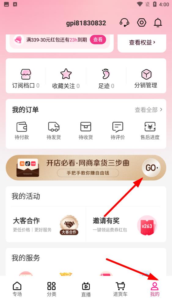 1、在界面中找到開店必看·網(wǎng)商拿貨三步曲板塊-點擊進(jìn)入開店教學(xué)頁面,了解大致的開店步驟流程。