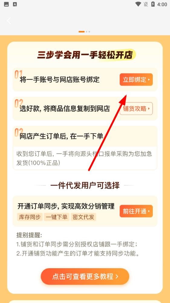 2、進(jìn)入開店教學(xué)頁面后看到第一步是將一手賬號與網(wǎng)店賬號綁定,點擊立即綁定按鈕按提示完成操作,選款后通過鋪貨攻略了解如何將商品信息復(fù)制到網(wǎng)店。