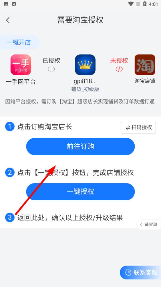 3、在需要授權(quán)界面訂購超級店長實現(xiàn)鋪貨及訂單數(shù)據(jù)打通,點擊前往訂購?fù)瓿捎嗁徍螅c擊一鍵授權(quán)按鈕完成店鋪授權(quán),最后返回確認(rèn)授權(quán)。